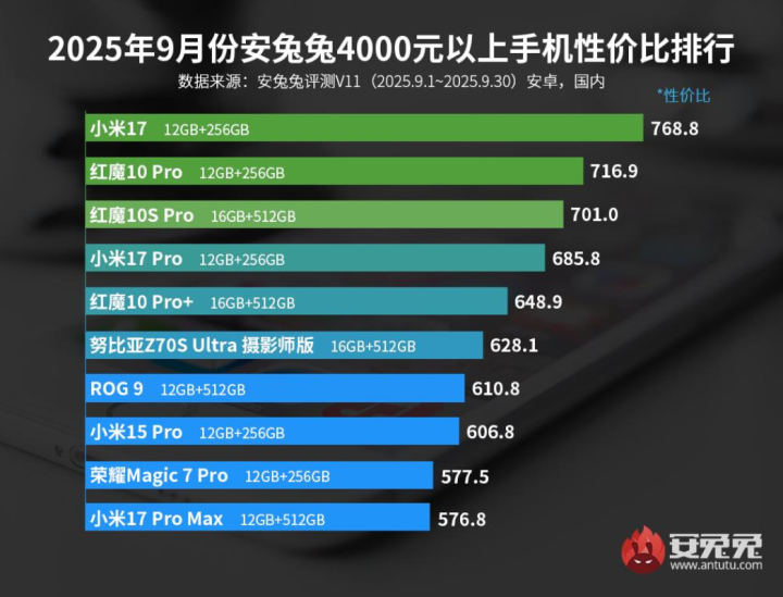 从安兔兔公布的9月份4000元以上的性价比手机排行榜单来看,小米17成功打败了其他的竞品。成为了高端机性价比第一名的宝座。这款小米17之所以能够打败其他的竞品,是因为它和其他友商的竞品相比,在性能方面有着非常明显的优势。毕竟它全球首发了第五代骁龙8至尊版处理器,这是目前安卓阵营最强的处理器,它的安兔兔跑分可以达到380多万,能够轻松的驾驭各种大型手游。